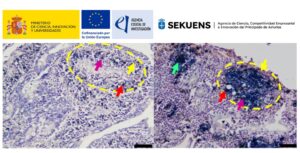 Irudia. PTB duten eta lesio multifokalak (ezkerrean) zein difusoak (eskuinean) dituzten behien jeiuno distalean egindako CK eta Iba1 markatzaileen immunohistokimika bikoitzaren emaitzen irudi adierazgarriak. Gezi gorriek bi aldiz tindatutako zelulen adibideak adierazten dituzte (urdin iluna edo beltza); gezi horiek soilik Iba1 positiboak diren zelulak adierazten dituzte (marroi kolorea); gezi arrosak CK positiboak diren zelulen adibideak erakusten dituzte (urdin bizia); eta gezi berdeek nukleo anitzeko zelula erraldoiak adierazten dituzte. Lesio multifokalak dituzten animalietan (ezkerrean), CKren adierazpenak MEak granulomaren inguruan kokatzen diren eredu bat erakusten du; aldiz, lesio difusoak dituzten animalietan (eskuinean), eredu desberdin bat ikusten da, non MEak granuloma osoan zehar banatuta dauden.